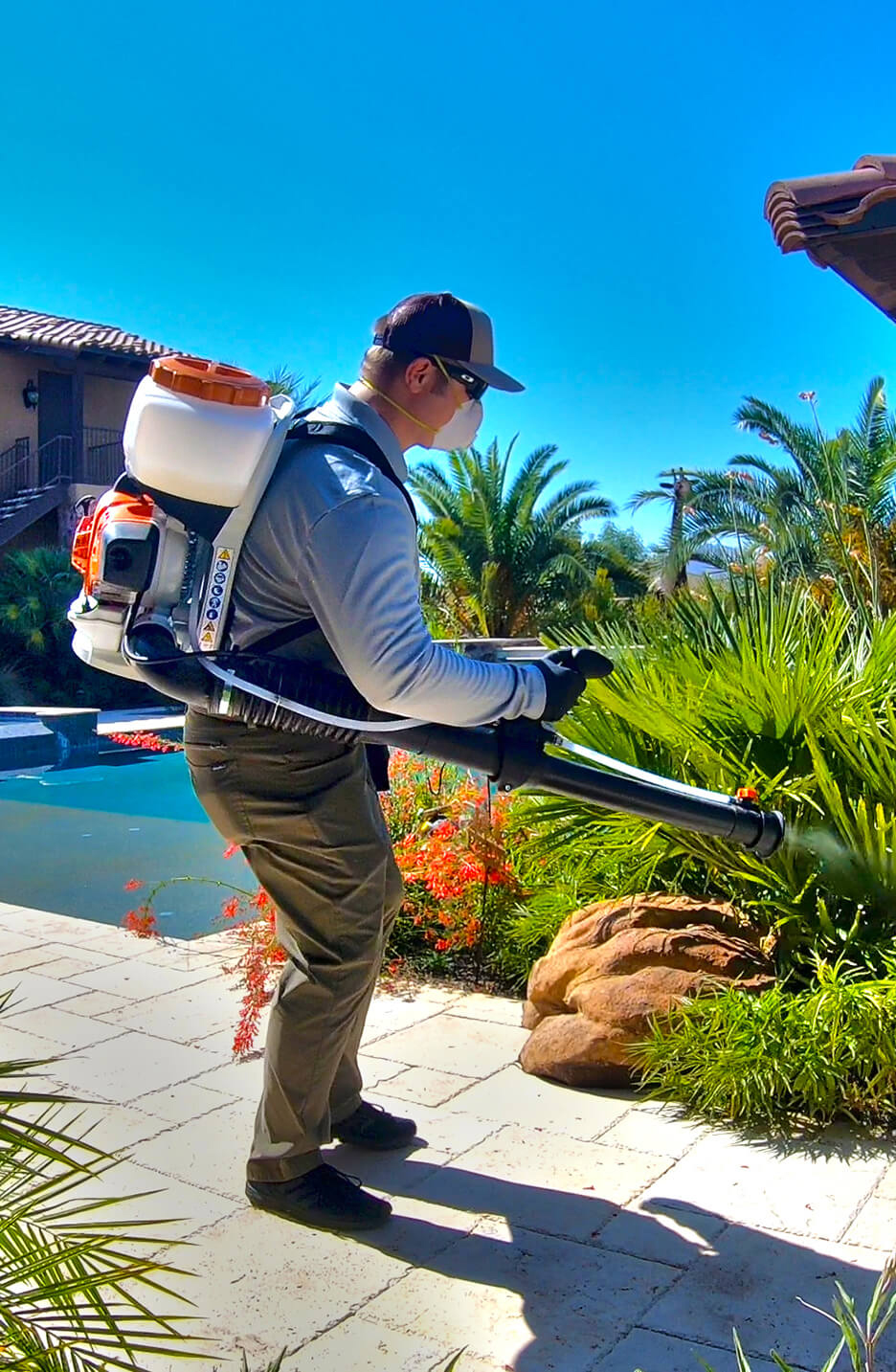 Mosquitoes will rest and hide from the sun during the day and then will come out for a blood meal at dusk and dawn. We look for and treat the dark, cooler, protected areas with the industry’s most proven products and with a gas-powered backpack blower/mister. This way we can reach the difficult areas and get maximum coverage. IF mosquitoes come on your property, they will be eliminated for up to 30 days. You receive this service with every visit….